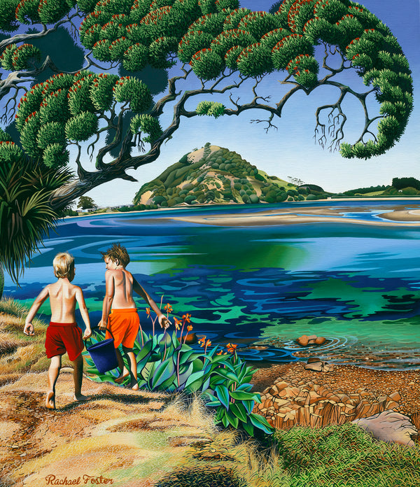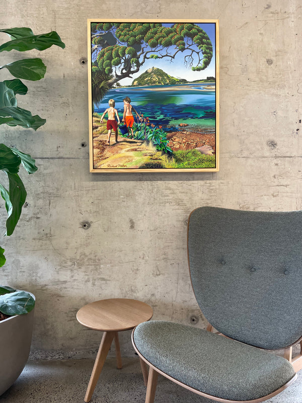 Pataua is somewhere we have frequented a lot over the past 7yrs, and has something individual about it, compared to the rest of that coast line. Its striking beauty at full tide creates another world inside the inlet that compliments the contrasting mood of the surf beach on the outside. Mothers with babies settle under umbrellas of pohutukawas, while toddlers dig holes at the shore line. An elderly couple float by at speed, toes poking out of the water and eyes filled with the joy of a 6 year old - they’re one of the many passengers on the current train that takes you to the open sea. Groms and their dads jossle for position out on the surf beach. all watched over by Treasure Island.